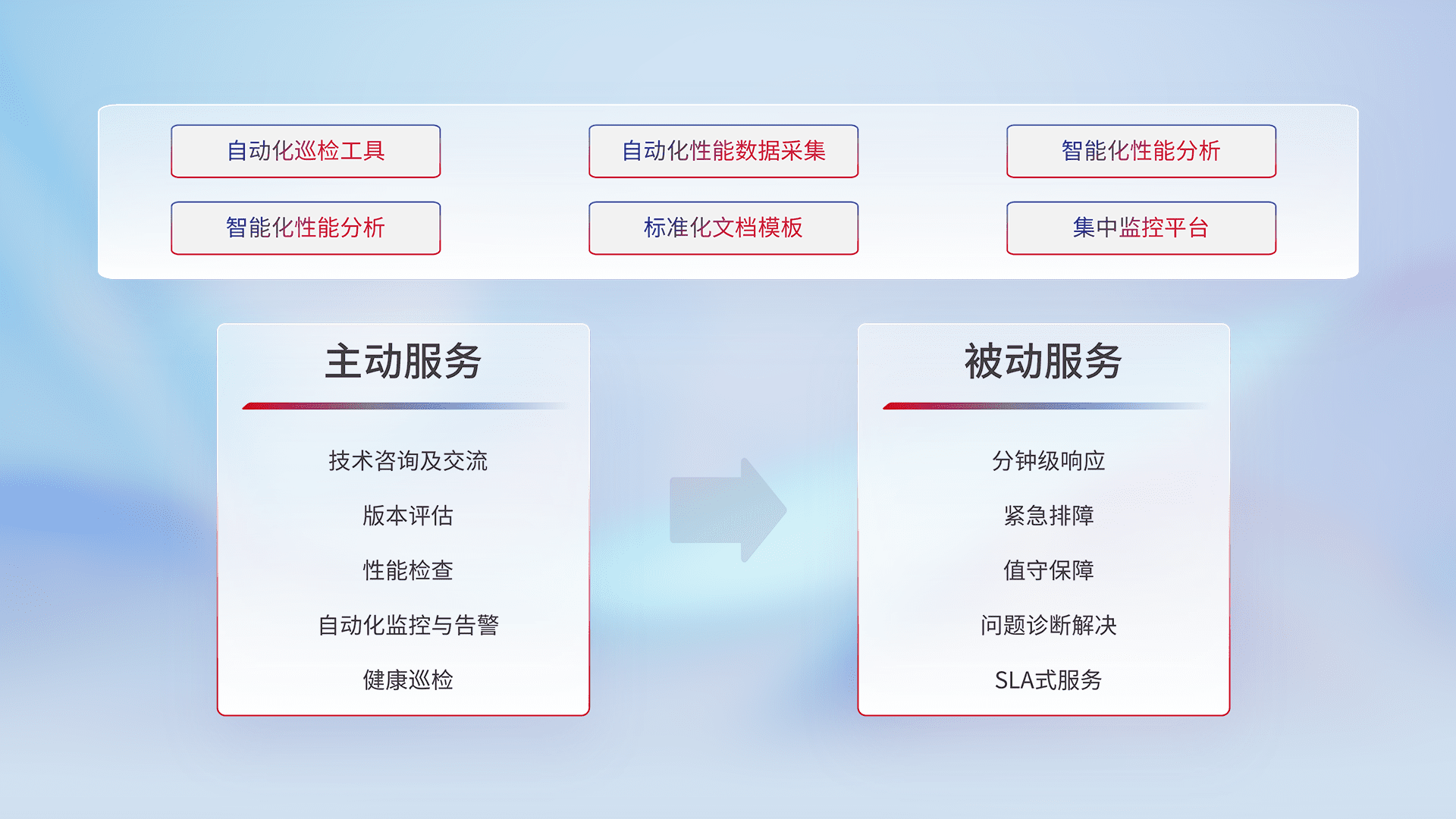 智能化工具和标准化文档,,,,保障服务质量,,提供主动服务(包含技术咨询、、、版本评估、、性能检查、、自动化监控与告警、、、、健康巡检)和被动服务包含(分钟级响应、、紧急排障、、、值守保障、、、、问题诊断解决、、SLA服务)。。。。